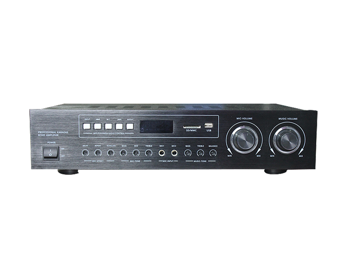 功能介绍a :黑色拉丝铝合金面板,沉稳高贵,尽显奢华.b :具数码显示功能,直观显示工作状态.c :多路信号输入信号切换,4路音频输出,两路话筒输入.d :智能双解码读卡播放器,支持WMA/MP3等音频格式,支持USB/SD/MMC卡等介质.e :音乐音量与话筒音量分开独立调节,同时具有话筒混响调节功能.