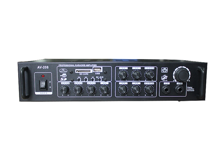 Function introduction A: multi channel signal input switch, two-way audio output, two microphone input. B: smart dual decoding card reader, WMA/MP3 and other audio formats, support USB/SD/MMC card and other media. C: music volume and microphone volume can be adjusted independently, with a microphone reverberation adjustment function. Distortion rate 2%